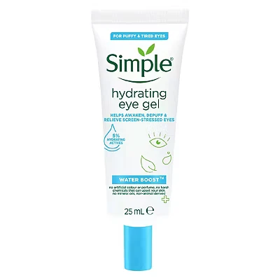 Simple Water Boost Hydrating Eye Gel provides eye care for tired eyes exposed to blue light from screens Our hydrating gel awakens tired eyes and visibly reduces puffiness leaving your eyes feeling refreshed, supple, and comfortable Simple eye gel restores hydration to the dry, dehydrated skin around your screen-stressed eyes, providing an instant feeling of revitalization Our hydration eye gel is infused with 5% hydrating actives, Active Pentavitin, potent antioxidant alfalfa, and minerals The presence of alfafa in our eye gel gives your skin antioxidant protection to fight against blue light Our eye gel contains no artificial colours or perfumes, no harsh chemicals, no alcohol, no mineral oils, and is non-animal derived