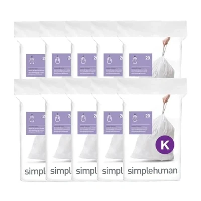 simplehuman Code K 200 Count, Genuine Custom Fit Liners, Drawstring Trash Bags in Dispenser Packs, 35 45 Liter / 9 12 Gallon, White