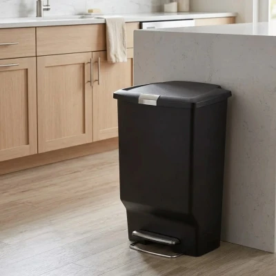The Simplehuman 45L Plastic Rectangular Pedal Bin in Black features a silent close lid, strong steel pedal, slim profile for space-saving, and a slide lock for safety. Its large capacity and stay-open lid make it ideal for busy households, while custom-fit liners ensure a clean and tidy experience.