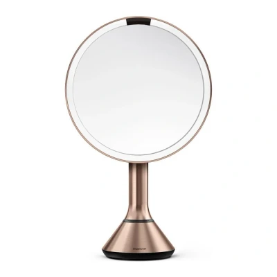 Beautiful round sensor mirror from the brand. Simplehuman The light turns on automatically as soon as you approach your face Its tru-lux light system simulates natural sunlight, so you can see all the colour nuances and know when your make-up is perfectly colour-coordinated and flawless With the touch brightness control bar, you can control the continuous brightness range quickly and intuitively Wireless and rechargeable, one charge lasts up to 5 weeks, 5x magnification, ideal for an exceptional detail view where you can still see your whole face at once