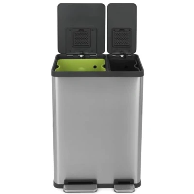 HIGH CAPACITY WASTE AND RECYCLING SOLUTION: Color coded liners in Green (38L) and Black (22L) allow for easy sortation of waste and recycling, without sacrificing waste capacity, and fit standard liners using bag cinch. HANDS-FREE USE: The stainless-steel foot pedal stands up to daily use and removes the need to touch the lid during waste or recycling disposal to keep hands clean. SLOW CLOSE LID: Quiet, controlled lid closure is designed to reduce unwanted noise and ease down gently.LID LOCK: Extended open lid lock keeps the container open for longer tasks and chores. BUILT IN FILTER FOR ODOR CONTROL. EASY TO MAINTAIN: Finish naturally hides fingerprints, smudges and dirt.