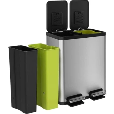 HIGH CAPACITY WASTE AND RECYCLING SOLUTION: Color coded liners in Blue (30L) and Green (30L) allow for easy sortation of waste and recycling, without sacrificing waste capacity, and fit standard liners using bag cinch. Freihändige Verwendung: Das Edelstahl-Fußpedal hält dem täglichen Gebrauch stand und eliminiert die Notwendigkeit, den Deckel während der Abfall- oder Recyclingentsorgung zu berühren, um die Hände sauber zu halten. Langsam schließender Deckel: Der leise, kontrollierte Deckelverschluss reduziert unerwünschte Geräusche und lindert sanft. Deckelverschluss: Die verlängerte Offenhaltefunktion sorgt dafür, dass der Deckel bei längeren Aufgaben oder Arbeiten offen bleibt. Integrierter Filter zur Geruchskontrolle. Pflegeleicht: Die Oberfläche verbirgt auf natürliche Weise Fingerabdrücke, Flecken und Schmutz.