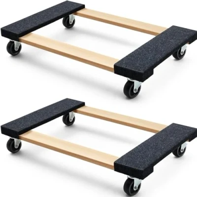 Includes two furniture dollies measuring in at 18 x 30 x 5 inches Each pair of dollies handles a 2000-pound static load and a 1320-pound dynamic load Four ball-bearing swivel casters make for easy rolling in any direction Perfect for workshops, schools, offices, garages, and more Hardwood body combined with the carpeted ends prevents scuffing and marring to sensitive cargo