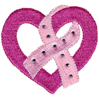 Pink Heart with Studs applique Measures approx. 7cm x 6.5cm Stick on and for permanent application Sew on Washable A donation will go directly to support Breast Cancer Care to assist in Cancer Reserarch