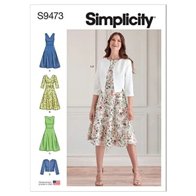 Misses' sewing pattern packet comes with sewing templates, fabric recommendations, pattern pieces, sizing guides, and instructions for (1) dress with length and sleeve variations, (1) jacket, and (1) belt Dress and jacket sewing pattern templates for misses' sizes 16, 18, 20, 22, and 24 Misses' dress features a flared skirt, self belt, an invisible back zipper, back waist darts, options for V-neck or jewel neckline, and optional 3/4 length sleeves; princess seam jacket has shaped hemlines and is fully lined Simplicity sewing patterns are comfortable, confident, and modern, perfect for staying on top of today's fashion trends Simplicity pattern sewing templates are proudly designed and printed in the USA