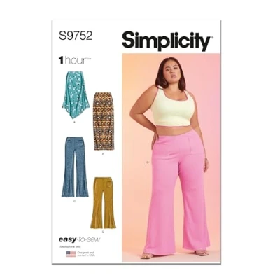 Sewing pattern packet comes with sewing templates, fabric recommendations, pattern pieces, sizing guides, and instructions This clothing sewing pattern packet is fitted for women's sizes 20W-22W-24W-26W-28W These easy-to-sew knit skirts and pants are must-have staples for your wardrobe; view A is an asymmetrical midi skirt, view B is a long skirt with a side slit, and views C and D are flare pants with hip patch pockets Simplicity patterns offer modern and vintage clothing options, trendy accessories, and tons of other unique sewing templates that can be personalized to your style Simplicity sewing patterns are proudly designed and manufactured in the United States