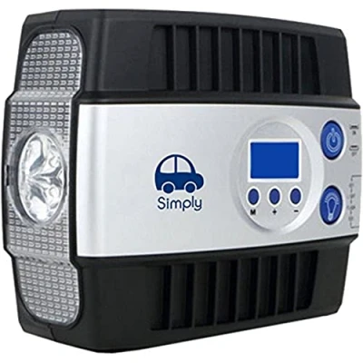 Simply DAC02 Digital Air Compressor, Compressor Tyre Pump LCD Gauge Display Screen, 100 PSI, 12V with Screw on Valve Connector, Integrated LED Torch, 2 Extra Nozzle Adaptors