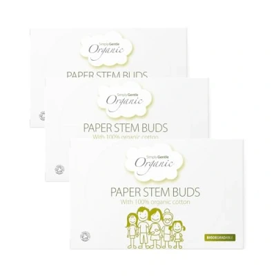 Simply Gentle Organic, Cotton Buds 100% Organic & FSC Paper Stems for Cleaning Delicate Areas around Eyes Outer Ears Eco Friendly Biodegradable 200 (Pack of 3)