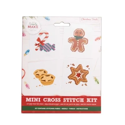 RELAXING Relax your mind and immerse yourself in the soothing and tactile world of cross stitch. Whether you're a seasoned crafter or a curious beginner, this sewing craft kit is your gateway to endless possibilities and hours of artistic enjoyment DESIGN Get ready to create a festive Christmas sewing masterpiece that will leave everyone complimenting your work. Ideal for relaxation & artistic expression, this kit is a must-have set for craft enthusiasts. Perfect set for making Christmas décor CONTENTS Mini cross stitch kit includes everything needed to create 4 festive 'Christmas treats' designs including stitching fabric, needle, thread & a set of handy instructions, perfect craft for the build up to the most wonderful time of the year! KIT Discover the timeless art of Christmas cross stitch with this all-inclusive kit. Create 4 festive designs, let your creativity flourish as you bring each stitch to life, perfect for home decor decoration and beginners too. Start stitching today! PRESENT Simply Make cross stitch kits add a dash of colour to Christmas decor or cheer up loved ones who need uplifting! Perfect birthday or Christmas gift, add a pop of colour to your festive decor, living room, kitchen, bedroom, room & office space