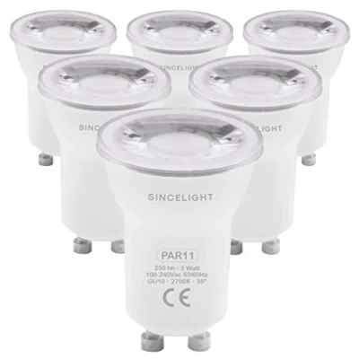 SINCELIGHT LED MR11 with GU10 Base (PAR11 MINI Reflector Ø35mm), Spot Light Bulb, 3 Watt, 250 Lumens, 25W Halogen Equivalent, 2700K(Warm White), High Color Rending RA≈85, 35 Beam Angle, Pack of 6