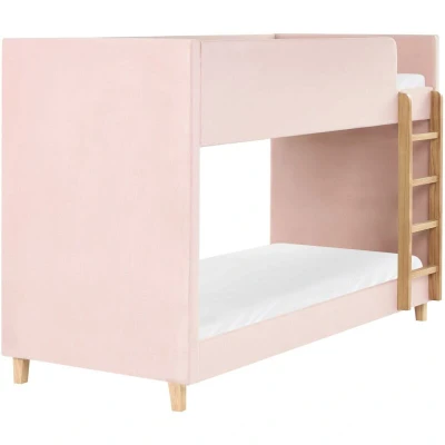 Kids Upholstered Bunk Bed with Ladder. This bunk bed is the perfect addition to any kids’ or guest room, offering both comfort and practicality. Upholstered in soft, durable velvet, it provides a cosy, inviting spot to sleep, while the sturdy wooden ladder and solid legs ensure safety and stability. Perfect for saving space, it combines functionality with style to create a warm, welcoming atmosphere. Details: Product Type: Bunk Bed General Color: Pink, Brown Shade: Pastel Pink Material Type: Fabric Main Material: Velvet Additional Material: Poplar Wood Material Composition: 100% Polyester Fabric Upholstered Back: No Storage: No Dimensions: Width: 97 cm Length: 214 cm Height: 143 cm Sleeping Surface: 90x200 cm Weight: 57 kg Weight Capacity: 150 kg Offer Includes: 1 x Bed Frame, 1 x Ladder, 2 x Slatted Frame (16 Rolled Slats), Not Included: Mattress, Bedding and Cushions Key Features: Designed to Complement Any Child's Bedroom, Timeless Design, High-Quality Materials, Meets the Rigorous
