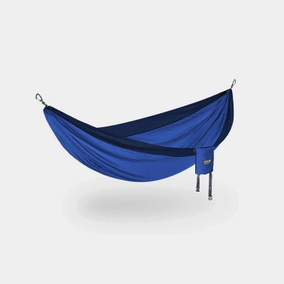 ENO (Eagles Nest Outfitters) are the original parachute hammock creators, and craft all their high-quality hammocks and accessories with one thing in mind...to help adventure travellers and outdoors lovers everywhere relax. Whether you're trekking into the depths of the jungle or weekending with friends at a festival, an ENO hammock will have you blissfully relaxed in suspended comfort. Very lightweight and compact when packed, the ENO DoubleNest Hammock is your all-access pass to relaxation. Providing ample room for one, the SingleNest packs away easily into its attached compression sack so you can take it anywhere, set it up in seconds flat, and lay back. Get close to each other while you get close to nature! It's made from breathable, quick-drying FreeWave nylon with heavy-duty triple-stitched seams, and uses specially-designed aluminium wire gate carabiners to hook onto a suspension system or any convenient hanging points. Improved design FreeWave 70D Nylon Taffeta - comfortable, breathable, and fast-drying fabric bluesign approved Heavy-duty triple-stitched seams for long-lasting durability Anodized 7075 Aluminium wiregate carabiners - hard-wearing and reliable Integrated stuff sack with internal stash pocket compresses to travel-ready size Compatible with all ENO hammock straps, stands, bug nets, rain tarps, and insulation systems Max load: 181kg/400lb Weight: 454g/16oz Dimensions (unfolded): 2.9m x 1.47m/ 9'6" x 4'10" Dimensions (packed): 8.9cm x 14cm/3.5" x 5.5" Colour: Navy/Royal