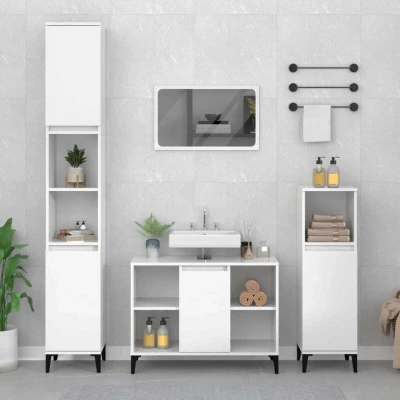 ManoManoGeneral description This sink cabinet is a great addition to your bathroom, providing a tidy and striking appearance. It features a high gloss white finish and is designed to offer ample storage space with its five compartments and a door, making it perfect for organizing your bathroom essentials. The top of the cabinet is ideal for placing a sink, enhancing both functionality and style. Technical specifications Colour: High gloss white Material: Engineered wood, metal Overall dimensions: 80 x 33 x 60 cm (W x D x H) Flexible door installation Usage Easy-to-clean surface: The cabinet can be easily maintained with a damp cloth. Warning: To prevent it from being overturned, this product must be used with the provided wall attachment device. Other information To make assembly as easy as possible, each product is delivered with a manual. The sink is not included.