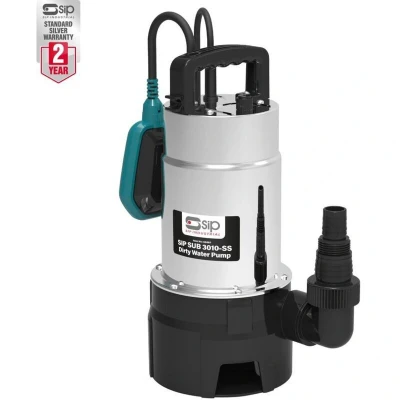 The SIP SUB 3010-SS Heavy-Duty Dirty Water Pump is ideal for draining dirty water from work areas and ditches, water tanks or vessels and large ponds. The pump is suited for heavy-duty use as a temporary or permanent fixture. Water pumps can help prevent costly damage to property or work areas from recurring rainwater or groundwater. This pump can also be used for a variety of agricultural and construction purposes. Applications & uses: Quickly drains flooded areas. Suitable for agricultural or construction environments. Designed as a temporary or permanent fixture. • Powerful brushless induction motor (1kW/1.3hp): Draws water at a max. flow rate of 300ltr/min through an impeller at the pump base. The heavy-duty wound motor is durable and lightweight. • Fitted float switch: Ensures the pump functions unaided when the activation depth (450mm) is reached. This prevents the pump from running dry and overheating when in use. • Max. 9mtr pumping head: Discharges water flow to a max. height