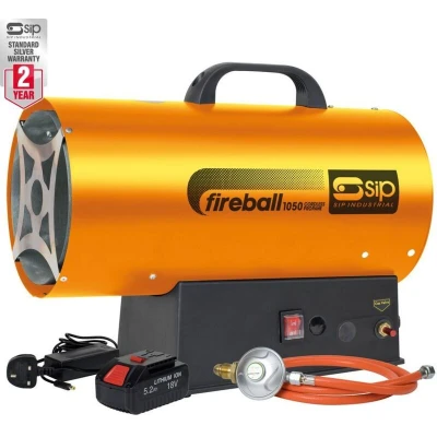 General description The SIP FIREBALL 1050 Cordless Propane Heater is an extremely lightweight and compact heating solution designed for various environments, including construction sites, garages, workshops, sheds, and warehouses. Its top-mounted handle allows for easy portability, making it convenient to use whenever needed. This powerful heater efficiently warms smaller areas, helping to maintain a consistent temperature. Technical specifications Heat Output: 102,364 BTU/hr (30 kW) Heating Area: 500 m³ (17,401 ft³) Battery Type: 18V DC 5.2Ah Lithium battery Average Fuel Consumption: 2.18 kg/hr Runtime: Up to 6 hours on a single charge Dimensions: Height 230 mm, Width 370 mm, Depth 450 mm Net Weight: 4.44 kg Compatibility and accessories Complete with gas hose and gas regulator Includes mains charger Optional spare battery sold separately Usage This heater is ideal for on-site, construction, and workshop applications, providing powerful heating without the need for a mains supply.
