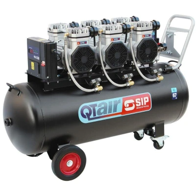 General description The SIP QT AIR DD 4.5hp 150ltr Ultra Low Noise Oil-Free Direct Drive Compressor is a powerful and innovative compressor designed for demanding applications in automotive settings and large workshops. It features a slow-running 4-pole motor pump unit that provides up to 50% longer working life compared to standard 2-pole motor air compressors. Operating at an ultra-low noise level of just 67dB, this compressor is ideal for work areas where noise is a concern. It delivers a piston displacement of 22.8CFM, resulting in a Free Air Delivery (FAD) of 18.2CFM from a single-phase supply. Technical specifications Input Supply: 230V (16A) Motor Power: 4.5hp (3.3kW) Receiver Size: 150 litres Piston Displacement: 22.8CFM (646 litres/min) Free Air Delivery (FAD): 18.2CFM (515 litres/min) Max Air Pressure: 116psi (8bar) Noise Level: 67dB Dimensions: L120 x W45 x H81.5 cm Weight: 95 kg Compatibility and accessories Includes a U-handle with a bracket and fixings for mounting a