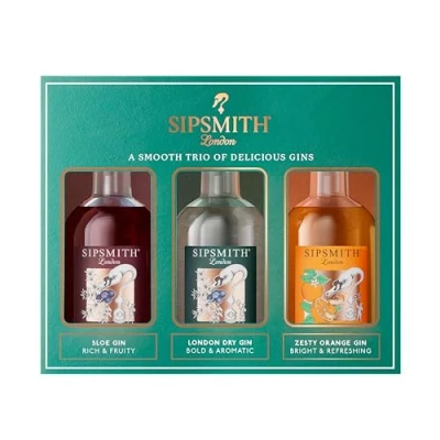 Three Sipsmith miniature 5clbottles hand crafted gin London Dry Gin, 5cl, bold, complex, and aromatic with a super-smooth mouthfeel, a classic London Dry style Sloe Gin, 5cl, truly handmade, subtle yet complex, and packed with rich, fruity flavour Zesty Orange Gin, 5cl, vibrant marmalade notes balanced with sweet cacao and orange blossom for a refreshing twist Absolute for gifting – Enjoy neat, in cocktails, or as a premium gin and tonic experience