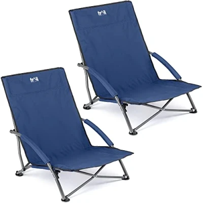2 x LOW FOLDING BEACH CHAIRS: Kick back, relax, and make the most of the sunshine with these Low-Slung Chairs from Trail. Lower than most chairs, with a seat height of 8cm, they’re perfect for kicking your legs out and reclining when you’re chilling on outdoor adventures. Pack includes 2 x chairs which are foldable to easily carry to the beach or campsite. STRONG & STURDY STEEL FRAME: Each chair has a tough tubular steel frame which has a criss-cross shape when unfolded. This helps to evenly distribute your weight for superior support when seated. The frame is also powder-coated for enhanced rust-resistance. Each chair measures approximately W56cm x D70cm x H62cm (to top of backrest) when set up. COMFORTABLE POLYESTER FABRIC: The seats are made from polyester fabric which is slightly elasticated to give it greater flexibility. This allows the seat to adjust to your bodyweight for the finest comfort. Unlike a solid plastic or wooden chair, you don’t need to place any cushions on it to create a comfortable surface when you’re soaking up the sunshine. PIVOTING FEET FOR MAXIMUM STABILITY: Pivoting feet allow the low-slung chairs to easily adapt to uneven surfaces and most terrains. The feet are specially designed to level the chair out on bumpy ground for greater stability and comfort when seated. Their circular shape also creates a larger surface area to stop them sinking into soft ground, such as sand. FOLDABLE WITH BAG TO EASILY CARRY: Because the chairs have a low-slung design, they’re smaller than most portable chairs. Each chair includes a drawstring bag with a strap to easily carry. When stored inside the bag, each chair measures 75cm x 15cm x 15cm (approx.) and weighs 5kg (approx.), making them lightweight and compact to carry.