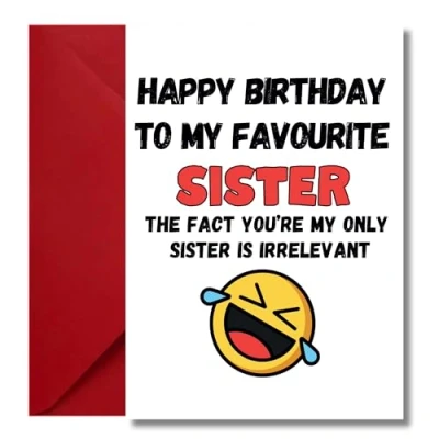 SUPER HIGH QUALITY: Made with premium 300gsm card for a sturdy feel, this A5 birthday card is blank inside for your personal message. Comes with a vibrant coloured envelope to make her birthday extra special. ππ FUNNY & HEARTFELT DESIGN: With the cheeky message, βHappy Birthday To My Favourite Sister. The Fact You're My Only Sister Is Irrelevant,β this is the ultimate sister funny birthday card that guarantees a laugh. ππ PERFECT FOR ALL SISTERS: Whether sheβs your big sister or younger one, this card is ideal as a big sister birthday card or a birthday card for sister adult to show your love with humour. πβ¨ VERSATILE FOR ANY AGE: Great for milestone celebrations like a sister 21st birthday card or a sister 40th birthday card, this card suits every age and keeps the fun going. π₯³π PERSONAL & UNIQUE: A great choice for a birthday card sister funny or a sister birthday card adult funny, itβs perfect for adding your personal touch to her special day. ππ
