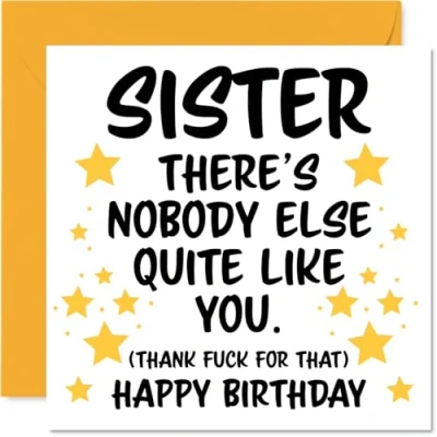 MAKE YOUR SISTER SMILE WITH THIS UNIQUE BIRTHDAY CARD: This exceptional quality Sister birthday card shows the design 'Sister Theres nobody else quite like you. (Thank fuck for that) Happy Birthday'. If you are looking for an awesome birthday card for Sister, then then this happy birthday Sister card is bound to make them smile. Not just a birthday card for Sister this could also be a birthday gifts for Sister, Sister in Law or Silbing. WHAT DO YOU GET: The card is printed on one side and BLANK ON THE INSIDE to allow you to write your very own message. The unique fun design is printed on a specially sourced and environmentally responsible board. At 360 microns thick the natural white one-sided gloss board has a quality look and feel. Supplied with a coloured gummed envelope to complement the design and ready to be sealed and sent in the post. Great Sister birthday cards, Sister in Law birthday card. NO INK SMUDGES: There is nothing worse than writing inside a card to find that the shiny surface makes the ink smudge. This is why we use a high quality one sided coated board. The uncoated side will absorb more of the ink from your pen to make smudging a thing of the past. Sister birthday cards, Sister birthday cards from Brother. SIZES: Greeting Card = 145mm x 145mm, Envelope = 155mm x 155mm, Card Thickness = 360 micron. Happy birthday Sister, Sisters birthday card, Sister cards birthday, birthday card Sister, happy birthday Sister card, Sister gifts from Brother. MADE AND QUALITY CHECKED IN THE UK: We print and manufacture all our products right here in the UK so you can be sure of a fast turnaround and a product that is expertly made. Using environmentally responsible premium board our card is conscious of the responsible management of the world's forests - happy birthday card Sister, Sister birthday cards.