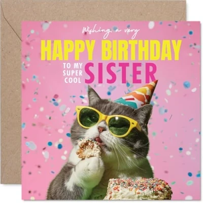MAKE YOUR SISTER SMILE WITH THIS UNIQUE BIRTHDAY CARD: This exceptional quality Sister birthday card for her shows the design 'Wishing a very Happy Birthday to my super cool Sister'. If you are looking for a beautiful birthday card Sister for her, then then this happy birthday Sister card is bound to make her smile. Not just a birthday card for Sister this could also be a birthday gifts for Sister, Sister in Law or Silbing. WHAT DO YOU GET: The cards are printed on both sides with the inside print saying 'Have an Amazing Day' and ample space for your own personal message. The unique fun design is printed on a specially sourced and environmentally responsible board. At 360 microns thick the natural white one-sided gloss board has a quality look and feel. Supplied with a coloured gummed envelope to complement the design and ready to be sealed and sent in the post. NO INK SMUDGES: There is nothing worse than writing inside a card to find that the shiny surface makes the ink smudge. This is why we use a high quality one sided coated board. The uncoated side will absorb more of the ink from your pen to make smudging a thing of the past. Sister birthday cards, Sister birthday cards from Brother. SIZES: Greeting Card = 145mm x 145mm, Envelope = 155mm x 155mm, Card Thickness = 360 micron. Happy birthday Sister, Sisters birthday card, Sister cards birthday, birthday card Sister, happy birthday Sister card, Sister gifts from Brother. MADE AND QUALITY CHECKED IN THE UK: We print and manufacture all our products right here in the UK so you can be sure of a fast turnaround and a product that is expertly made. Using environmentally responsible premium board our card is conscious of the responsible management of the world's forests - happy birthday card Sister, Sister birthday cards.