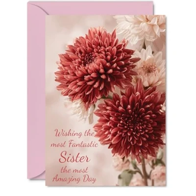 Sister Birthday Card Red Chrysanthemums Happy for from Brother Sibling, A5 Flowers Bday Greeting Cards