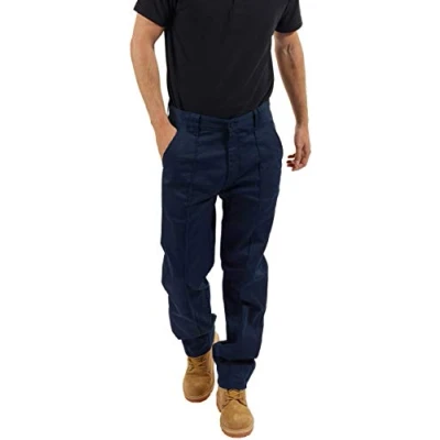 SITE KING Mens Classic Workwear Trousers in Black or Navy. 2 Standard Deep Side Pockets & 1 Buttoned Rear Pocket. YKK Zip Fly & Button Fastening at Waist, Twin Wide Belt Loops Reinforced for Strength. Straight Leg Design & Sewn Front Seam for a Traditional Smart Formal Appearance. 245 GSM - 65% Polyester & 35% Cotton. Machine washable to 85 degrees.