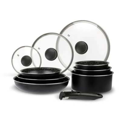 Aluminium Cookware Set 10 Pieces: 3 Frying Pans Diameter 20, 24, 28 cm + 3 Saucepans Diameter 16, 18, 20 cm + 3 Glass Lids Diameter 16, 20 and 24 cm + Removable Handle Pressed aluminium pans and pans for quick and optimal heat distribution; their Whithford Xylan PFOA-free non-stick coating is ideal for healthier cooking and easy cleaning. These utensils are certified for all types of hobs: induction, gas, electric and glass-ceramic hobs. Oven safe (180°max), dishwasher-safe, fridge-safe. Thanks to its SITRAMOVIBLE handle made of durable thermo plastic that can be clipped and unclipped, save space, gain practicality, gain agility in the kitchen. Since it has become an essential part of the equipment of French fireplaces SITRAM has marked several generations with its famous slogan "If you do not take a SITRAM, you risk taking a bowl!", Weight: 10.912881969 Pounds, Manufacturer: Sitram