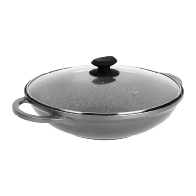 Sitram Wok Cast Aluminium Minera Range Diameter 32 cm H 8 cm - Stone Effect Interior/Dark Grey Exterior - Includes Glass Steam Lid - Cast Aluminium Handles - Body Thickness 2.8 mm Base Thickness 3.5 mm This Wok is certified for all types of hobs: induction, gas, electric and glass-ceramic hobs. Dishwasher and fridge safe. Whitford Xylan 2 Layer Stone Effect PFOA Free Non-Stick Interior Coating 3.5mm thick bottom for better thermal shock resistance. For better preservation of your SITRAM cookware, let them cool before washing to avoid deformation due to a large thermal shock. The dimensionally stable cast aluminium allows optimal heat distribution and distribution, ensuring even cooking and reducing your energy consumption. Since it has become an essential part of the equipment of French fireplaces SITRAM has marked several generations with its famous slogan "If you do not take a SITRAM, you risk taking a bowl!"