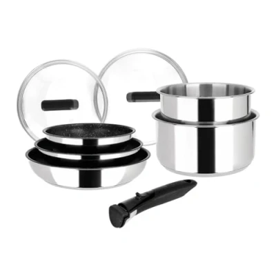 Sitram 8 Piece Stainless Steel Cookware Set: 3 Frying Pans (20 24 28 cm) + 2 Saucepans (16 18 Glass Lids Removable Handle, Suitable for All Heat Sources