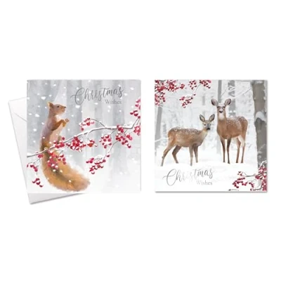 20 Assorted Christmas Cards – Features two classic robin designs full of seasonal charm. Silver Foil Finish – Adds a touch of festive elegance and sparkle. Compact Size – Each card measures 14 x 14 cm, perfect for easy mailing. Eco-Friendly – Made with 100% recyclable cards and packaging. Winter Woodland Theme – Reindeer and Squirrel illustrations bring warmth to the holidays. Ideal for Gifting or Sending – Thoughtful and stylish way to share festive wishes.