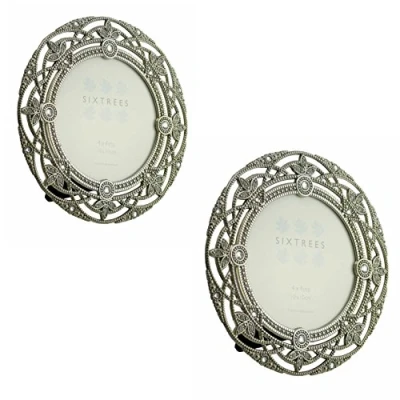Sixtrees a TWINPACK of Antique Vintage and Shabby Chic Style silver metal photo frames with beads crystals for 4" (102mm diameter) picture Helena