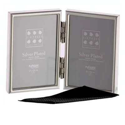 A highly polished Silver plated folding photo frame for two 3" x 2" pictures. Lacquered and tarnish resistant The metal profile forms a smooth rounded edge and is approximately 3/8" (9mm) wide and 1/2" (12mm)deep. Pictures are easily inserted by sliding off the back and we have included a microfibre polishing cloth to clean the glass and frame when fitting your photo. Features a sturdy velour covered strut back , suitable for free standing tabletop display only These frames look great either on their own or as part of a group. They are suitable for almost any decorating theme. They make a perfect present and are ideal for weddings and anniversaries. Provided tissue wrapped in a box, making an ideal gift