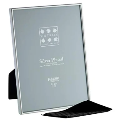 A highly polished Silver plated photo frame for an 8" x 6" picture. Lacquered and tarnish resistant The metal profile forms a smooth rounded edge and is approximately 3/8" (9mm) wide and 1/2" (12mm)deep. Pictures are easily inserted by sliding off the back and we have included a microfibre polishing cloth to clean the glass and frame when fitting your photo. Features a sturdy velour covered strut back and has two hooks, allowing free-standing or wall hanging display in either direction. These frames look great either on their own or as part of a group. They are suitable for almost any decorating theme. They make a perfect present and are ideal for weddings and anniversaries. Provided tissue wrapped in a box, making an ideal gift