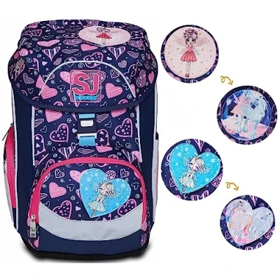 SJ GANG Backpack, UPDOWN BOX HEARTLY MIX Eco friendly Ergonomic Knapsack, For 1st Grade Kids School, Sport, Free Time, with Side Pockets, many Compartments, Shoulder Straps Adjustment System