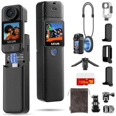 SJCAM C300 128G Card, 4K Pocket Action Camera,7H Power,170FOV Handheld Camera,6 Axis Stabiization POV Cam,Wearable Body Cam,3800mAh Vlogging Camera With Magnetic Lanyard &Tripod, Black