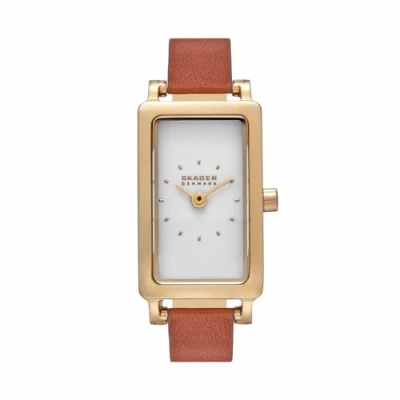 This Skagen Micro Hagen Analogue Watch for Women is the perfect timepiece to wear or to gift. It's Gold Rectangular case combined with the comfortable Brown Leather watch band will ensure you enjoy this stunning timepiece without any compromise. Operated by a high quality Quartz movement and water resistant to 3 bars, your watch will keep ticking. A true modern classic. This rectangular gold-tone stainless steel watch features a sleek 30mm case, glossy white dial, and two-hand quartz movement. High quality 19 cm length and 8 mm width Brown Leatherl strap with a Buckle Case measurment: 15 X 24 mm,case thickness: 6 mm, case colour: Gold and dial colour: White