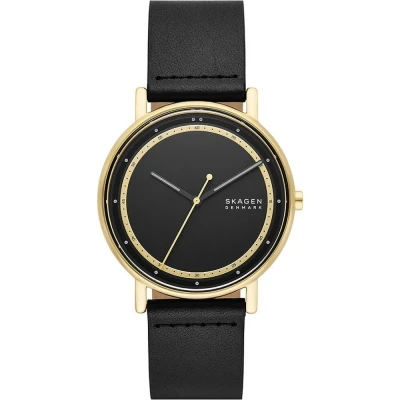 This Skagen Signatur Analogue Watch for Men is the perfect timepiece to wear or to gift. It's Gold 40 mm Round case combined with the comfortable Black Leather watch band will ensure you enjoy this stunning timepiece without any compromise. Operated by a high quality Quartz movement and water resistant to 5 bars, your watch will keep ticking. Elegant and fashionable watch that is suitable for the daily life of every Men. High quality 21 cm length and 20 mm width Black Leather strap with a Buckle Case diameter: 40 mm,case thickness: 7 mm, case colour: Gold and dial colour: Black