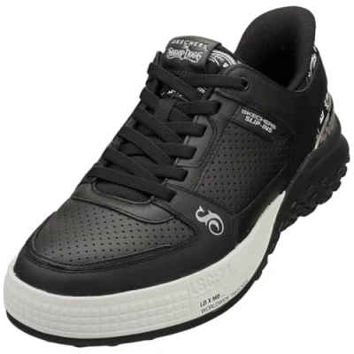 From the Skechers x Snoop Dogg collab featuring Snoop's very own designs Skechers Hands Free Slip-ins for an easy fit. Exclusive Heel Pillow holds your foot securely in place Skechers Air-Cooled Memory Foam cushioned comfort insole Lace-up court style fashion sneaker. Smooth and perforated leather upper with paisley print heel cup and metallic heel trim Durable traction outsole with medial and lateral heel wrap