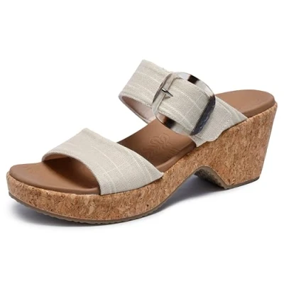 Cushioned and contoured comfort footbed with Luxe Foam. Adjustable buckle with double strap. 1" midsole with cork wrap. 2.25" overall wedge heel height. Flexible traction sole.