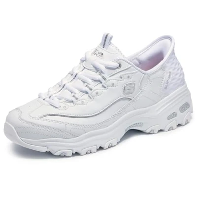 Skechers Hands Free Slip-ins for an easy fit Skechers Air-Cooled Memory Foam cushioned comfort insole Iconic Skechers D'Lites design Fashion lace-up sneaker with smooth genuine leather and quarter webbing mesh upper