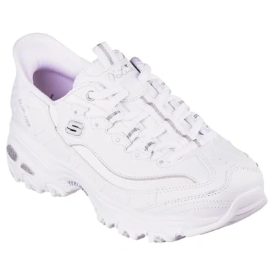 Skechers Hands Free Slip-ins for an easy fit Skechers Air-Cooled Memory Foam cushioned comfort insole Iconic Skechers D'Lites design Fashion lace-up sneaker with smooth genuine leather and quarter webbing mesh upper