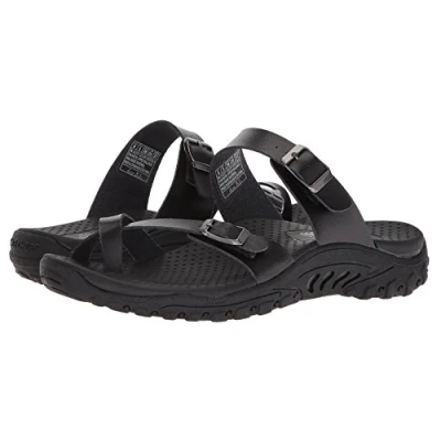 Skechers Women's Reggae Carribean Double Buckle Toe Thong Slide Sandal, Black, 8 M US