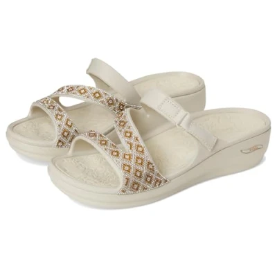 Lightweight flexible EVA upper and Luxe Foam cushioned comfort footbed Patented Skechers Arch Fit contoured footbed with podiatrist-certified arch support Contoured footbed helps mold to your foot to reduce shock and increase weight dispersion Open-toe strappy design with bead embellished upper and adjustable cross strap Durable dual-density traction outsole for stability