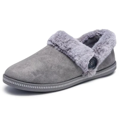 Cushioned comfort footbed with memory foam Soft suede textured microfiber fabric upper Contrast faux fur collar and instep trim Flexible traction outsole Woven fabric slip on upper with cozy warm lining and faux fur trim