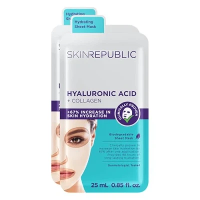 Skin Republic Hyaluronic Acid + Collagen Sheet Mask Clinically Proven to Provide 48 Hours of Long Lasting Hydration. Made in Korea. (Pack 2)