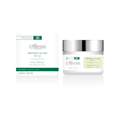 Shield and rejuvenate your skin with skinChemists SPF30 Wrinkle Killer Sun Protection Day Moisturiser. This powerful multi-tasking formula combines the best of both worlds: broad-spectrum sun protection and advanced anti-aging benefits.. Key Benefits:. Hybrid Broad-Spectrum SPF 30: Offers balanced protection from harmful UVA and UVB rays, preventing premature aging and sun damage.. Hydration & Anti-Aging: Deeply hydrates and plumps the skin.. Nourishing & Soothing: Sweet Almond Oil nourishes and softens, while Aloe Vera and Chamomile Extracts soothe and calm irritated skin.. Antioxidant Protection: Tocopherol (Vitamin E), Beta-Sitosterol, and Squalene neutralize free radicals and protect the skin from environmental damage.. Gentle Exfoliation: Citric Acid promotes cell turnover for a brighter, more even complexion and refined texture.. Lightweight & Non-Greasy: The hybrid formula absorbs quickly, making it ideal for daily use under makeup.. Targets: Those seeking daily sun protection and anti-aging benefits in a lightweight moisturizer.. Skin Type: Suitable for all skin types, especially those concerned with sun damage and aging.. The Power of a Hybrid Formula. This unique formula blends chemical and mineral UV filters for comprehensive protection:. Physical SPF (Titanium Dioxide & Zinc Oxide): Creates a barrier on the skin to reflect and scatter UV rays.. Chemical SPF (Homosalate, Octocrylene): Absorbs UV rays and converts them into harmless heat.. Together, they offer:. Broad-Spectrum Protection: Against UVA and UVB rays.. Enhanced Stability: More effective protection over time.. Lightweight & Comfortable: Easy to apply and wear under makeup.
