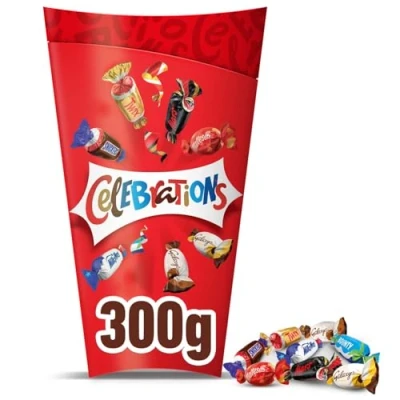 Chocolate gift box full of everyone's favourite mini chocolate bars and chocolate biscuits including Mars, Twix, Snickers, Bounty, Galaxy, Galaxy Caramel, Malteser Teasers & Milky Way Individually wrapped chocolates, the perfect chocolate gifts for any occasion! Whether you're looking for a sweet caramel treat for a birthday or a nougat delight to show someone you care Struggling to find the perfect present? Celebrations chocolate gift box is the answer. Great as family gifts, sharing chocolate or bulk snacks in a fun flip lid box Share a sweet moment with a holiday chocolate box, and bring a bit of joy to those around you. Celebrations chocolates are the perfect choice as Birthday, Easter or Christmas chocolate or even to add to your DIY Advent calendar 1x Celebrations Gift Selection Box of Chocolates containing 300g of milk chocolate bars in an assortment of flavours, perfect for sharing with friends and family