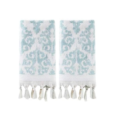 Includes 2 hand towels Made of premium, yarn-dyed Turkish cotton Soft and absorbent terry jacquard with hand-knotted tassels along the hem and a 2-tone medallion pattern; colors reverse on opposite side *Please note that due to the hand-knotted nature of the tassels some may come untied during wash. Simply re-knot, tying high towards the end hem to help avoid tangling Double-stitched side seams for added durability and strength OEKO-TEX certified guarantees that our towels are free of harmful chemicals 100% Turkish Cotton 16" x 26" Machine wash