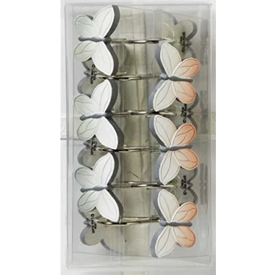 Includes 12 Shower Curtain Hooks Sculpted butterfly design with hand-painting Resin/Metal 2" x 2" Wipe clean for easy care